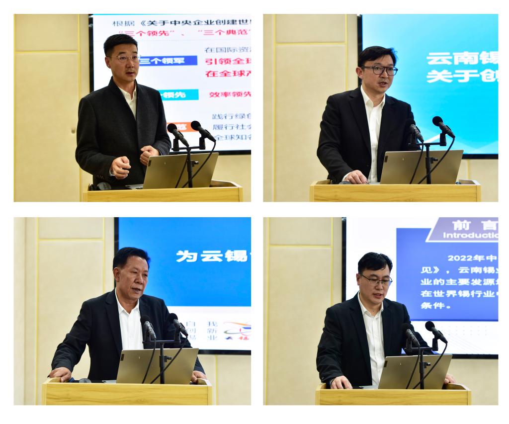 控股公司戰(zhàn)略管理部匯報(bào)前期工作進(jìn)展、基礎(chǔ)條件和相關(guān)政策解讀;控股公司財(cái)務(wù)管理部、投資管理部、組織人事部、創(chuàng)新&數(shù)字化中心、錫業(yè)股份、研究院公司(研發(fā)中心)、物流公司圍繞如何創(chuàng)建世界一流企業(yè)分別發(fā)言。