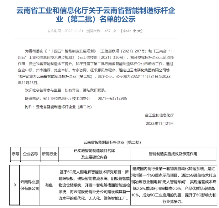 成功入選云南省智能制造的標桿企業,標志著錫業股份在智能化制造、數字化轉型、科技創新等方面又邁出了更高步伐。其在銅業分公司實施的“基于5G無人銅電解智能技術研究”項目,成為5G工業應用的先驅,提升了5G影響力和行業競爭力。