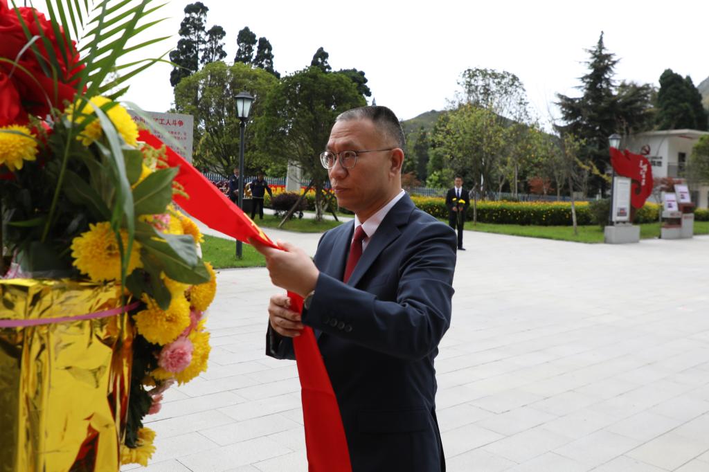 天地英雄氣,千秋尚凜然。青山翠柏環繞的“中共個舊錫礦特別支部”愛國主義教育基地莊嚴肅穆,李鑫、戴德明、楊逢春烈士群雕巍然屹立。以控股公司黨委、控股公司、控股公司工會、控股公司團委名義敬獻的4個花籃一字排開,花籃紅色緞帶上“革命烈士永垂不朽”的金色大字熠熠生輝。