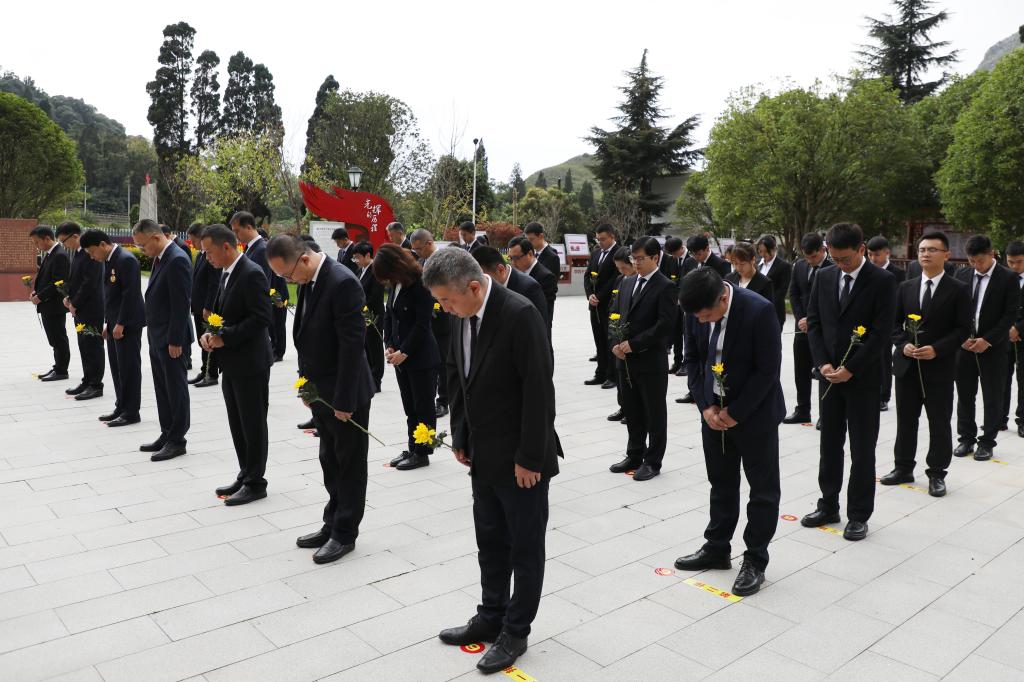 全體人員依次走到紀念碑前,獻上手中鮮花并瞻仰紀念碑。