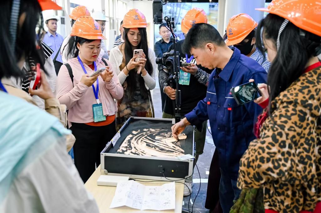 期間,錫業分公司在智慧運營中心打卡點開展沙畫創作展示。云錫文聯沙畫作家在尺寸之間,如同放映機般,把錫冶煉廠貌、錫錠產品、直線澆鑄工業機械臂等代表性鏡頭揮沙成畫、栩栩如生,吸引眾多來賓打卡拍攝。