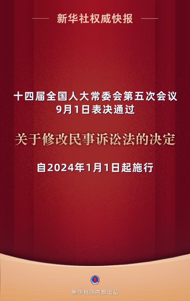 2023年9月1日,十四屆全國人大常委會第五次會議表決通過了《關于修改〈中華人民共和國民事訴訟法〉的決定》,自2024年1月1日起施行。