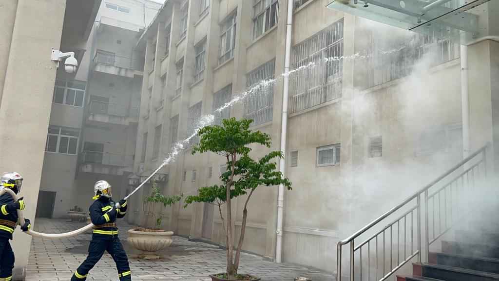 隨著演練模擬的火災(zāi)煙霧開始蔓延,演練人員方案的要求按滅火行動組、通訊聯(lián)絡(luò)組、疏散引導(dǎo)組、安全救護組、安全警戒組、宣傳運輸保障組分工協(xié)作,保證了科技樓疏散人員用毛巾掩住口鼻,沿預(yù)定路線有序撤離,火災(zāi)得以及時撲滅。